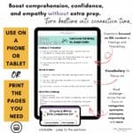 • SEL questions –  Emotional growth prompts that help your child develop empathy, kindness and perspective-taking.
